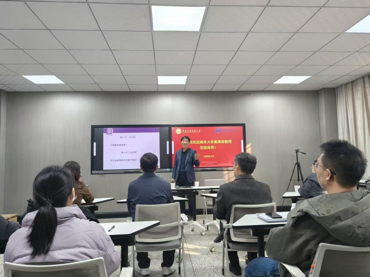2025年12月8日下午,南京大学秦厚荣教授来我校作题为《从解方程到伽罗华理论》的学术报告。数学学科骨干教师参加了本次学术报告,报告由理学院副院长宫春梅教授主持。